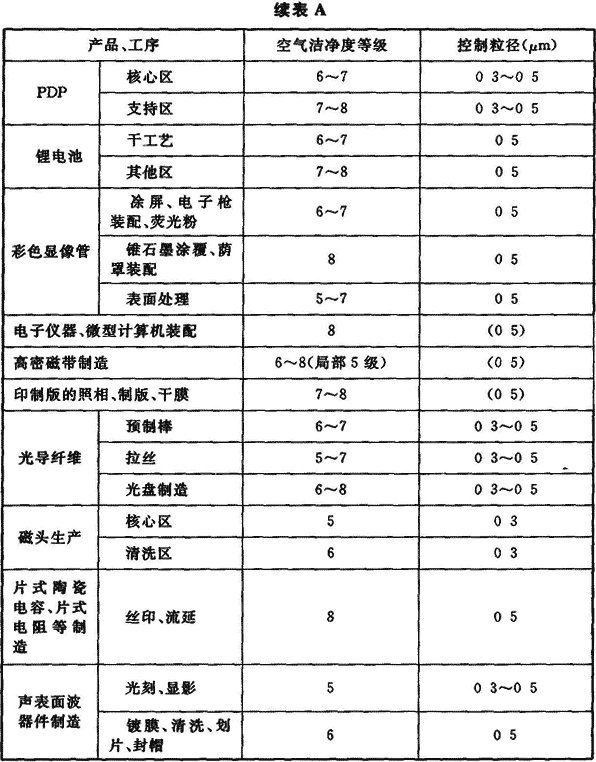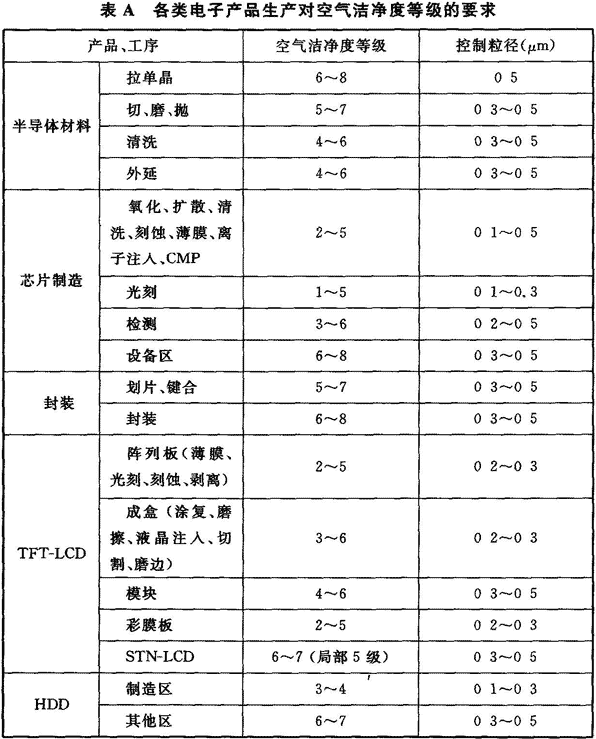 附錄A 各類電子產(chǎn)品生產(chǎn)對(duì)空氣潔凈度等級(jí)的要求