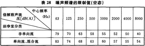14.1.4 電子工業(yè)潔凈室(區(qū))的噪聲頻譜限制值,應(yīng)采用倍頻程聲壓級,各頻帶聲壓級不宜大于現(xiàn)行國家標(biāo)準(zhǔn)《潔凈廠房設(shè)計(jì)規(guī)范》GB 50073-2001的規(guī)定,現(xiàn)將該規(guī)范的相關(guān)規(guī)定摘錄在表28中。