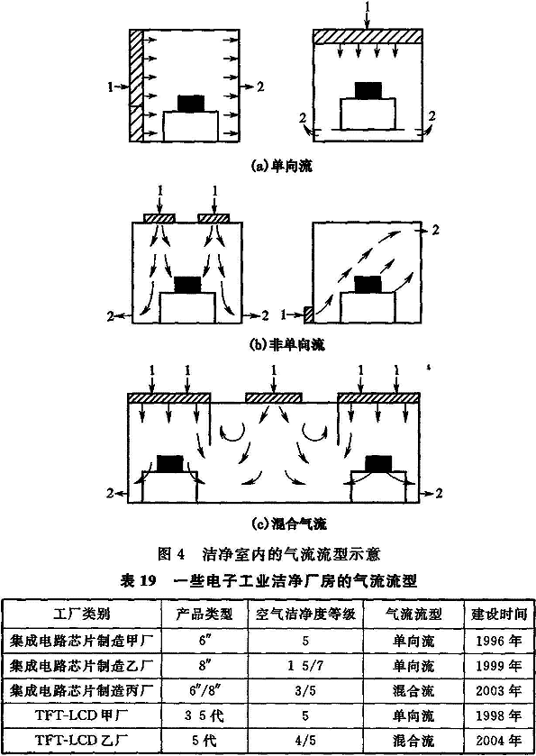 本條推薦的潔凈室(區)內氣流流型的設計要求,是基于數十年電子工廠潔凈廠房工作實踐的經驗總結,并結合國際標準化組織ISO/TC 209技術委員會已經頒布、實施的《潔凈室及相關受控環境標準》IS0 14644—1、IS0 14644-4中有關氣流流型的要求和近年來國內建成投產的電子工業潔凈廠房所采用的氣流流型的實際狀況制定的。圖4是IS0 14644-4中對潔凈室氣流流型的圖示。表19是一些電子工業潔凈廠房的氣流流型。上述情況表明:空氣潔凈度等級為1~5級時,基本上采用單向流或混合流,空氣潔凈度等級為6~9級時,基本上采用非單向流,且混合流流型可應用于所有各種空氣潔凈度等級的潔凈室。