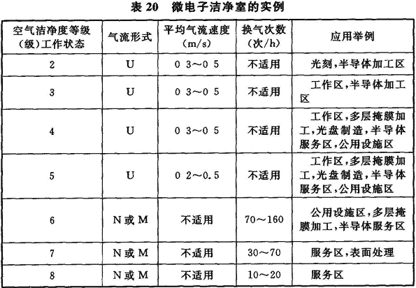 1 表20是根據國際標準化組織ISO/TC 209技術委員會編寫、發布的《潔凈室及相關受控環境標準》ISO 14644—4《潔凈室的設計、建造和試運行》中的表B.2微電子潔凈室的實例,列出了空氣潔凈度等級為2~8級的氣流流型、潔凈送風量的數據。