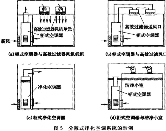 7.3.1 電子工業潔凈廠房中的凈化空調系統的主要形式為集中式和分散式,圖5是幾種分散式凈化空調系統的典型圖示。從圖中可見,各種形式各具特點和適用性,在實際應用中,應根據具體工程項目的潔凈室規模、空氣潔凈度等級和電子產品生產工藝特點及其要求確定,同時考慮運行經濟和降低能量消耗。
