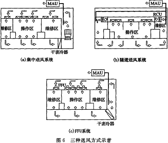 7.3.2 電子工業潔凈廠房,尤其在規模較大的集成電路芯片生產和TFT-LCD生產用潔凈廠房的送風方式有集中送風、隧道送風和風機過濾機組送風等類型,各種送風方式各具特點和適用性,圖6是各種送風方式的示意圖。圖6中:(a)集中送風系統(CentralSystem),室外新風經新風處理裝置(MAU)后,與經表冷器降溫和風機增壓后的回風混合,通過高效過濾器送至潔凈生產層。(b)隧道送風系統(Tunnel System),潔凈區的回風經維修區與新風處理(MAU)后的新風混合后,由循環空氣處理裝置送入送風靜壓箱,通過空氣過濾器送入潔凈區。(c)FFU系統,潔凈區回風經表冷器降溫后與處理后新風混合,通過FFU增壓、過濾送入潔凈區。三個系統各有利弊,其選擇主要與電子產品生產工藝、能量消耗、建設投資等有關,有時也與業主的意愿有關,但近年來在集成電路潔凈廠房中,采用FFU系統者日益增多。