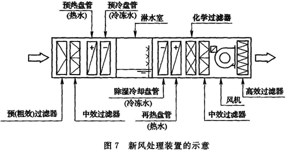 3 有利于強化對室外新風的處理,在微電子、光電子用潔凈室的送風中,不僅要求控制微粒、溫度、相對濕度等,還要求去除影響產品質量或降低成品率的分子態化學污染物,如Na、SOx、NOx、Cl、B等,這些污染物主要來自室外大氣中。為此,對于此類潔凈廠房需對室外吸入新鮮空氣進行嚴格處理,常常可以采用淋水法去除大氣中的SOx、NOx和Cl;采用化學過濾器和活性炭過濾器,利用物理吸附和化學吸附的原理,將低濃度的分子態化學污染物去除到規定的濃度要求。圖7是某微電子工業潔凈廠房的新風處理裝置示意圖,采用了11個功能段——兩級加熱、兩級表冷、兩級淋水、四級過濾和一級加濕。