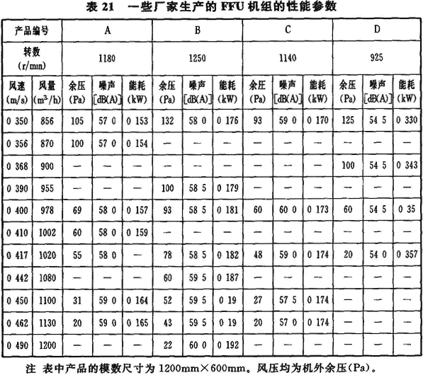 7.4.2 風機過濾機組(FFU)是將風機與高效過濾器(HEPA)或超高效過濾器(ULPA)組合在一起,構成自身可提供推動力的末端空氣凈化裝置。它由風機、過濾器、機殼和電器控制等部分組成。FFU的主要技術性能包括風量(一般以斷面風速表示)、余壓、能耗、效率、噪聲和控制方式等。目前國內電子工業潔凈室應用FFU越來越多,不僅在大面積、空氣潔凈度要求嚴格的單向流或混合流潔凈室(區)采用,而且在各種用途的、面積不是很大的單向流或混合流潔凈室(區)中也有應用。目前在應用中受到各方面關注的主要是FFU裝置的經濟性(投資、運行費)、風量和余壓、噪聲、能耗等性能參數,表21是對國內市場的幾個制造廠家生產的FFU裝置的實測性能參數。