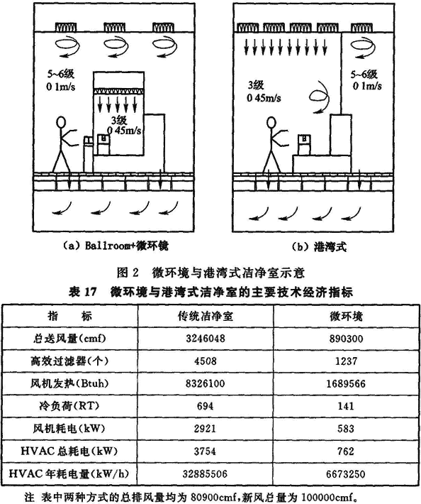4.2.3 電子工廠潔凈廠房是能源消耗量大、建設(shè)投資大的廠房,為了使?jié)崈魪S房的建設(shè)獲得較好的節(jié)能和經(jīng)濟(jì)效益,從潔凈室型式的選擇開始就應(yīng)該認(rèn)真地分析比較,選擇既滿足電子產(chǎn)品生產(chǎn)工藝要求,又能做到降低能耗、減少建設(shè)投資和降低運(yùn)行費(fèi)用等需求。目前在超大規(guī)模集成電路工廠采用微環(huán)境類型的潔凈室,是一種能滿足以上要求的混合流潔凈室。圖2是Ballroom+微環(huán)境潔凈室與港灣式潔凈室的對比圖示,圖中(a)將要求大面積的單向流平均風(fēng)速為0.45m/s變化為只有微環(huán)境范圍內(nèi)小面積,而大部分空間均采用5~6級、平均風(fēng)速約為0.1m/s。兩種方式的主要技術(shù)經(jīng)濟(jì)數(shù)據(jù)的比較見表17,從表中數(shù)據(jù)可見:Ballroom+微環(huán)境潔凈室能量消耗少,也可做到總體建設(shè)投資少,所以當(dāng)空氣潔凈度等級要求十分嚴(yán)格時,宜采用此種類型。