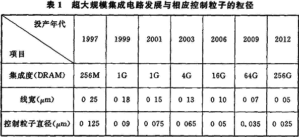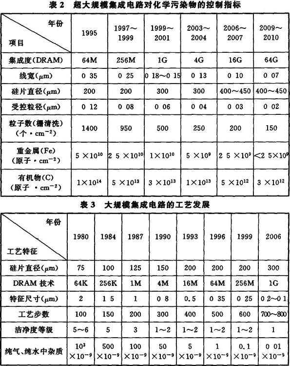 3.1.1~3.1.3 隨著科學技術的發(fā)展,電子產(chǎn)品生產(chǎn)日新月異,以微電子產(chǎn)品為代表的各種電子產(chǎn)品生產(chǎn)技術發(fā)展迅速?,F(xiàn)代電子產(chǎn)品要求微型化、精密化、高純度、高質(zhì)量和高可靠性,以人們熟悉的手機、筆記本電腦為例,它所使用的集成電路、電子元器件以及其組裝的生產(chǎn)過程都要求在受控環(huán)境條件下進行操作,其中以集成電路生產(chǎn)過程對受控環(huán)境的要求尤為嚴格,當今線寬為45nm的超大規(guī)模集成電路產(chǎn)品已投入生產(chǎn),其受控生產(chǎn)環(huán)境——潔凈室(區(qū))的受控粒子尺寸要求小于0.02μm甚至更小。表1是超大規(guī)模集成電路的發(fā)展及相應控制粒子的粒徑。集成電路產(chǎn)品的生產(chǎn)和研究表明,超大規(guī)模集成電路生產(chǎn)所需受控環(huán)境不僅嚴格控制微粒,而且還需嚴格控制生產(chǎn)環(huán)境的化學污染物和直接與產(chǎn)品生產(chǎn)過程接觸的各種介質(zhì)——高純水、高純氣體、化學品的純度和雜質(zhì)含量,表2是超大規(guī)模集成電路對化學污染物的控制指標。表3是大規(guī)模集成電路的工藝發(fā)展。
