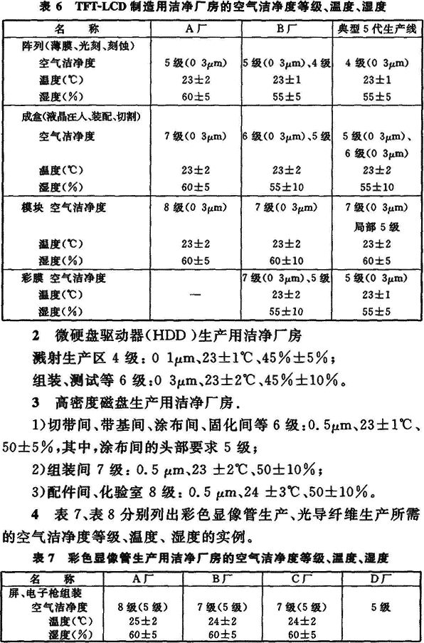 8 等離子顯示器(PDP)生產(chǎn)用潔凈廠房:涂屏間等:5.5級、25±2℃,50%±10%;其他生產(chǎn)間:6.5~8級、20~26℃、55%±10%。
