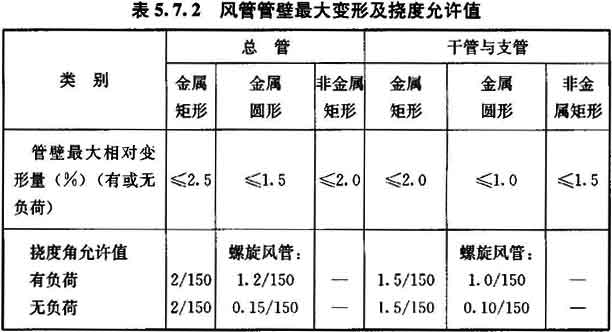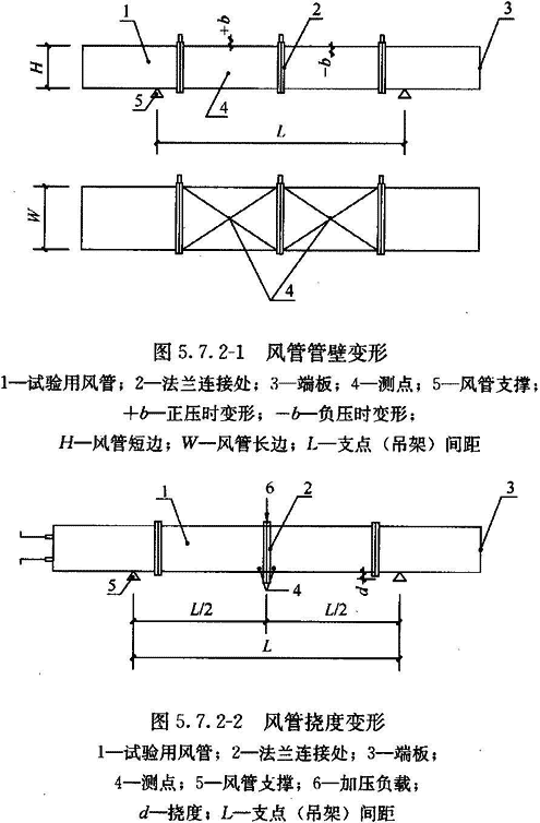 10 外購成品風管應有變形試驗。風管管壁最大變形相對量(表面最大不平度b與風管短邊長度H之比,圖5.7.2—1)及撓度角允許值[兩段風管組合件中央連接法蘭部位的撓度量d與該兩風管組合的兩吊架(支點)間距一半L/2之比,見圖5.7.2—2]應符合表5.7.2的規定。