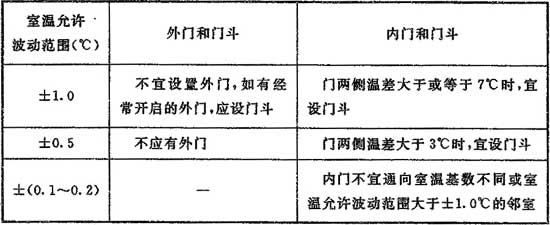 8.1.12 工藝性空氣調節區的門和門斗應符合表8.1.12的規定。外門門縫應嚴密,當門兩側的溫差大于或等于7℃時,應采用保溫門。