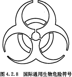 4.2.8 二級、三級、四級生物安全實驗室的入口,應明確標示出生物防護級別、操作的致病性生物因子、實驗室負責人姓名、緊急聯絡方式等,并應標示出國際通用生物危險符號(圖4.2.8)。生物危險符號應按圖4.2.8繪制,顏色應為黑色,背景為黃色。
